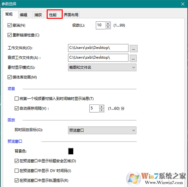 2、打开参数选择窗口后,切换到“性能”选项卡。