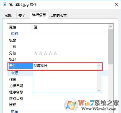 2、在照片属性界面点击“详细信息”选项卡,找到“备注”一栏,点击“备注”后面空白的“值”,就可以输入需要备注的文字,输入完成后点击应用并确定即可。