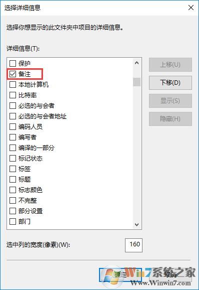 3、在详细信息框中找到“备注”并将其勾选起来,点击“确定”就可以了。