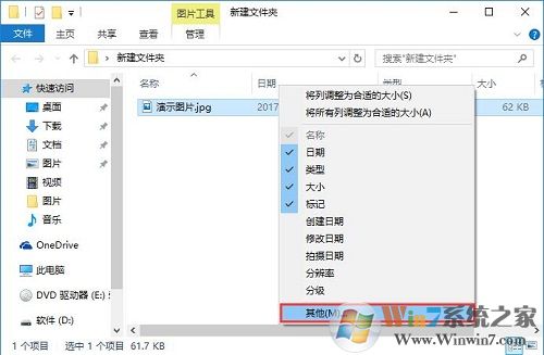 2、在“名称”、“日期”、“类型”、“大小”或“标记”任意一栏上单击鼠标右键,选择“其他”;