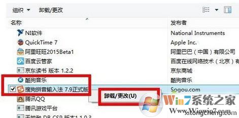 2、在其下拉菜单中找到搜狗输入法,右击,选择“卸载/更改“选项,然后将其卸载(如果卸载也出错则跳过此步骤);