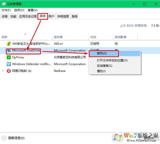 2、选择启动,在启动选项下右键点击禁用OneDrive。