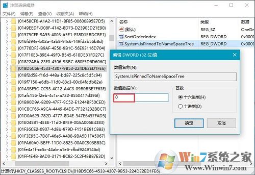 3、在右侧找到System.IsPinnedToNameSpaceTree项,双击打开其设置,将其数值从1改为0,点击确定。