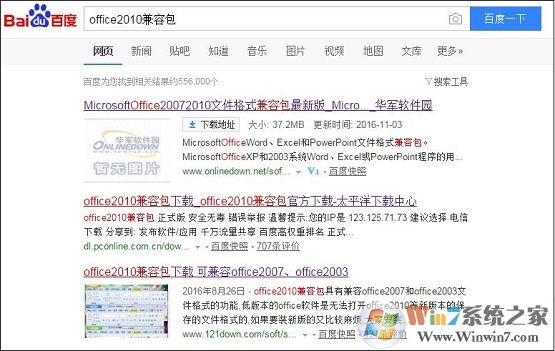 1、在百度中输入查找关键字“office2010兼容包”,出现很多的搜索结果;