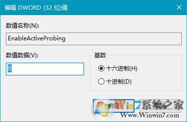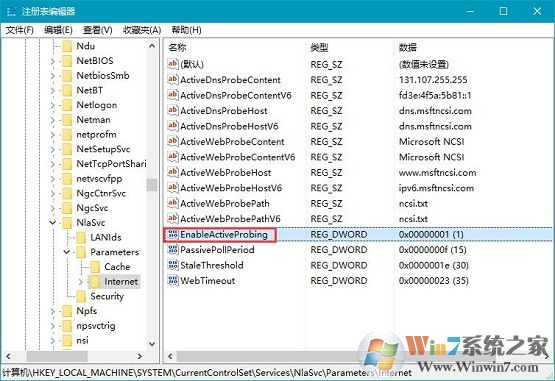 2、在注册表左侧依次展开:HKEY_LOCAL_MACHINE\SYSTEM\CurrentControlSet\Services\NlaSvc\Parameters \Internet,在右侧找到并打开EnableActiveProbing,如下图所示: