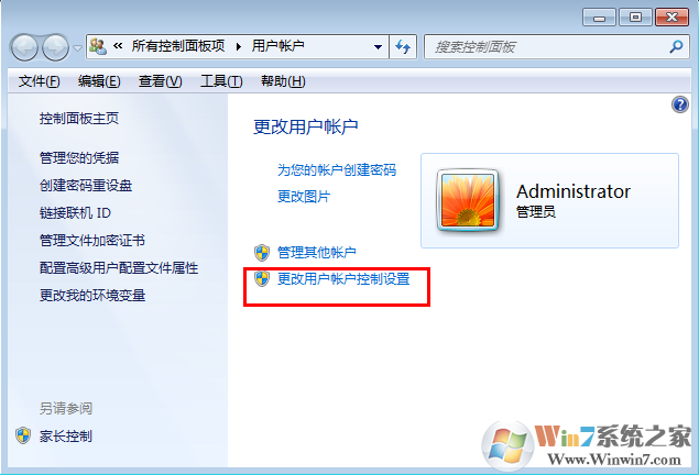 4、单击更改账户信息最后一个选项:更改用户账户控制设置。
