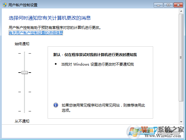④:从不通知:选择该选项后,将会关闭UAC功能,无论程序或用户修改系统设置均不会弹出授权对话框。随着UAC的关闭,Win7的安全性也会大大降低,一般不建议选项此项。