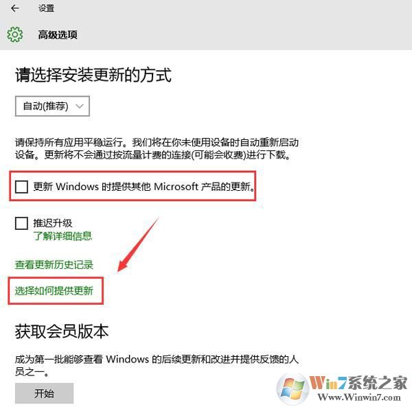 3、接着先取消勾选“更新windows时提供其他microsoft产品的更新”,再点击“选择如何提供更新”,如图所示: