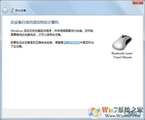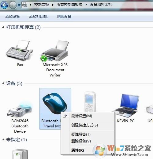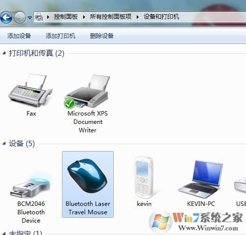 7)连接成功后,在“设备和打印机”中会有鼠标的显示,有些品牌的设备在win7中,可以直接显示产品的外观。