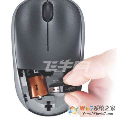 2、将接收器插入电脑USB接口,将电池放入鼠标内(注意正负极不能反),装好电池后,将鼠标的电源开关打开,部分无线鼠标没有开关,装上电池自动开启。