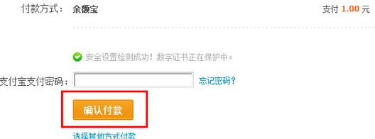 2、输入支付密码,点击【确认付款】即可使用余额宝进行支付,如图: