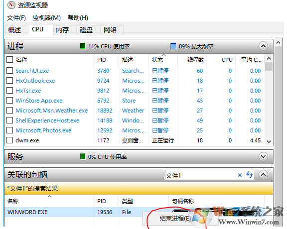 3、点击“关联的句柄”栏右侧的小箭头,将其展开。在搜索栏中输入文件名“文件1”,然后按一下回车键。