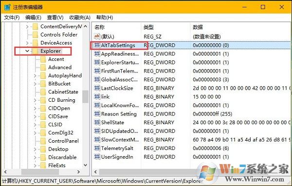 2、依次展开“HKEY_CURRENT_USER\SOFTWARE\Microsoft\Windows\CurrentVersion\Explorer”,找到“AltTabSettings”,如图: