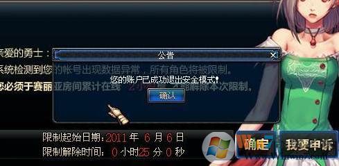 1、进入游戏界面后,出现安全模式提示,我们点击确定解除按钮