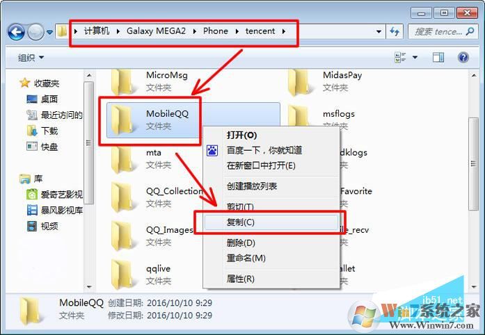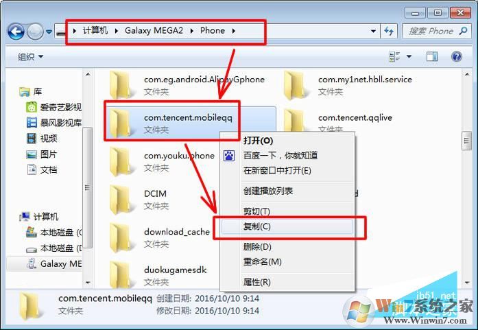 5,接下来再次把安卓手机连接到电脑上,打开手机所在盘符后,找到com.tencent.mobileqq文件夹,对其复制后,再将其粘贴到电脑上的任意文件夹中。(为了便于管理,最好也复制到第一步复制出来的MobileQQ相同的目录下)