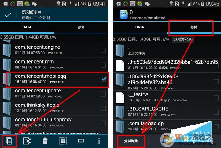 4,在安卓手机上打开刚安装的app,勾选中data/data/目录下的com.tencent.mobileqq,对其进行复制后,切换到“存储”选项卡,然后点击“复制到此”按钮。说明:如果您安装的RE文件管理器上没有存储选项卡的话,可以点击窗口上方的“..”返回到上一层目录,直到返回到根目录,然后再进入sdcard文件夹,并点击“复制至此”即可。