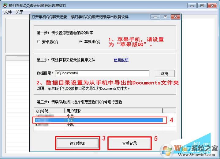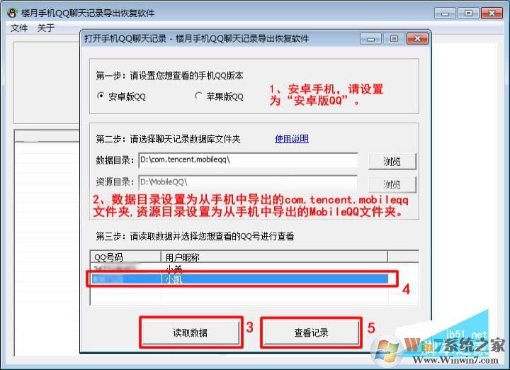 6,打开“楼月手机QQ聊天记录导出恢复软件”,按下图说明文字进行设置,设置及点击顺序为下图12345的顺序。