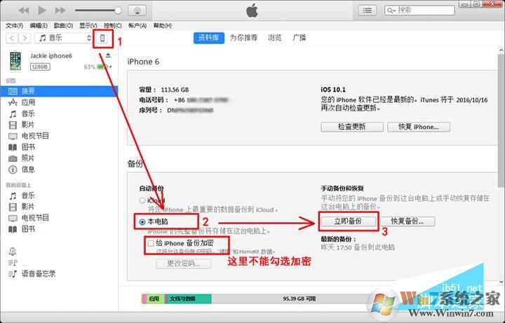1,要找到苹果手机QQ聊天记录所保存的文件夹,我们需要先借助苹果公司的iTunes软件,我们先利用该软件把手机中的数据全部导出到电脑上。导出方法很简单,只需把手机连接到电脑上,然后点击iTunes软件界面上的123处即可(如下图所示)。
