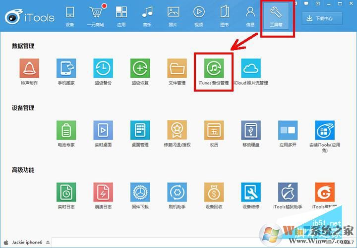 3,接着打开iTools软件,切换到“工具箱”页面,再点击“iTunes备份管理”。说明:现在的iTools最新版本为iTools4,下图为iTools3的截图,但iTools4与iTools3界面差不多。