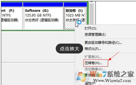 1、在磁盘管理中,对一个磁盘进行删除或是压缩卷操作,在这里我以“I盘”合并到“G盘”为例,演示一下将“I盘”合并到“G盘”的操作过程,首先单击“I盘”选择“压缩卷”;
