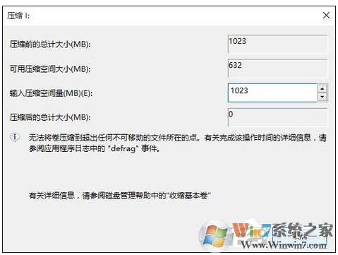 3、计算核实压缩空间后,出现压缩大小量控制界面,见下图,在允许的范围内选择自己所需要的数据,注意它是从卷的末尾处压缩现有分区的,所以压缩空间量就是指的留给D/E们的空间。