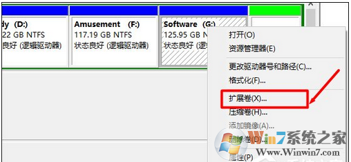 5、压缩完成会在G盘右边出现一个绿色的盘符,这里系统默认的规则是:比如你扩展G盘,可用空间必须在G盘右边且相邻,鼠标右键单击G盘,选择扩展卷;