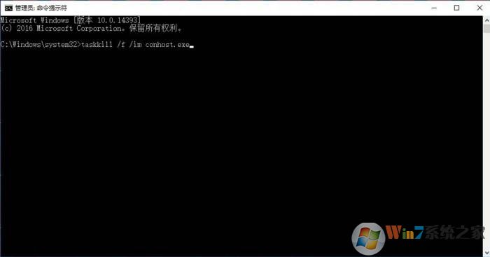 2、打开命令提示符之后,输入: taskkill /f /im conhost.exe 回车;