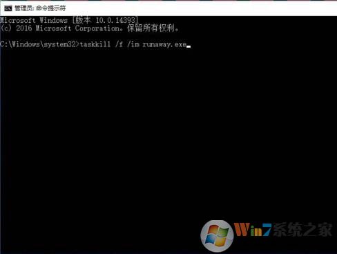 4、再打开命令提示符,输入 :taskkill /f /im runaway.exe 回车(这个步骤结束病毒主体)