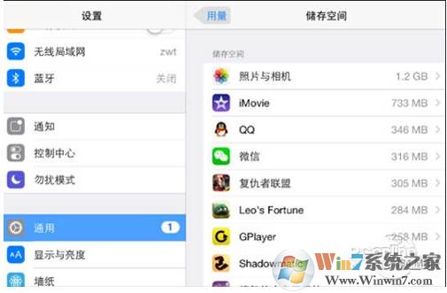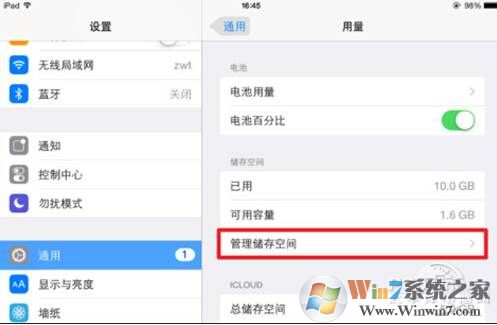 2、接着,我们打开iPad的【设置】-【通用】-【用量】的【管理储存空间】