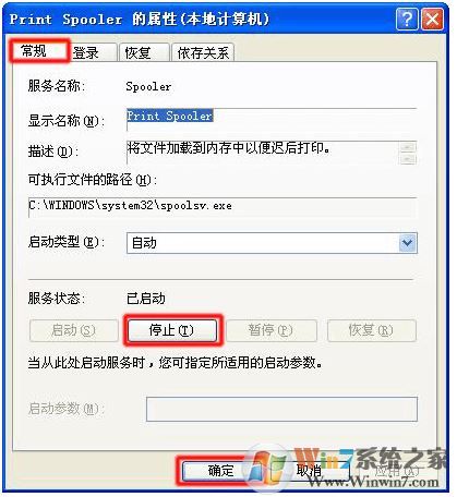 4、在“Print Spooler 的属性(本地计算机)”窗口中,选择“常规”选项卡,点击“停止”按钮,然后点击“确定”按钮。如图停止服务所示: