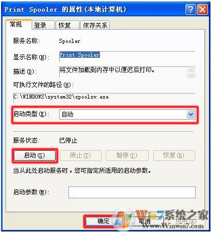 11、在“Print Spooler 的属性(本地计算机)”窗口中,确保“启动类型”已设置为“自动”,点击“启动”按钮,然后点击“确定”按钮。如图 11 启动服务所示: