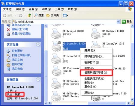 3、在“打印机和传真”窗口中,右键点击您使用的打印机图标,选择“使用联机打印机”菜单项。如图 1 使用联机打印机所示: