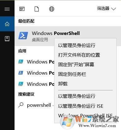 1、点击Cortana,在搜索框输入“powershell”,右键以管理员身份运行Windows Powershell组件。