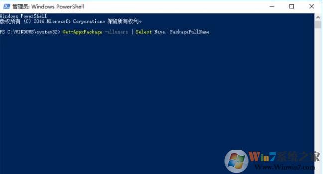 2、输入命令“Get-AppxPackage -allusers | Select Name, PackageFullName”,获取当前系统安装的所有应用。
