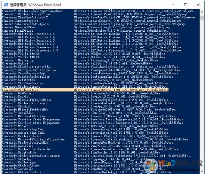 3、在列表中找到名称为“Microsoft.WindowsStore”(即应用商店)的应用,然后复制右侧对应的包名称。Microsoft.WindowsStore_11701.1001.99.0_x64__8wekyb3d8bbwe