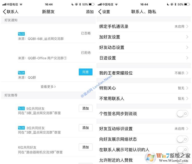 如下图:QQ手机版左侧好友推荐功能、右侧设置中没有此方面设置