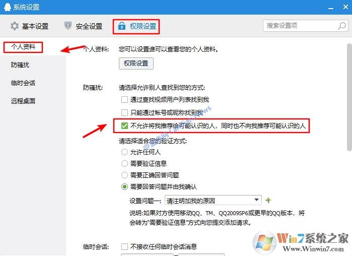 2、接着在QQ设置面板中依次点击权限设置—>个人资料—防骚扰功能,然后就可以看到下图中红框显示的选项。