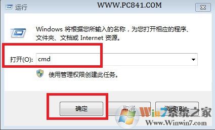 1、使用Win+R组合快捷键打开运行对话框,然后在打开后面,键入cmd命令,然后点击底部的确定,如下图: