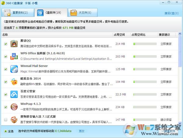 2、然后在C盘软件下,查看自己的软件是否在内,如果在内,而且显示立即搬家,那么就好办了,可以搬家的软件一般搬家后都不会有问题,建议保留的不建议移动;