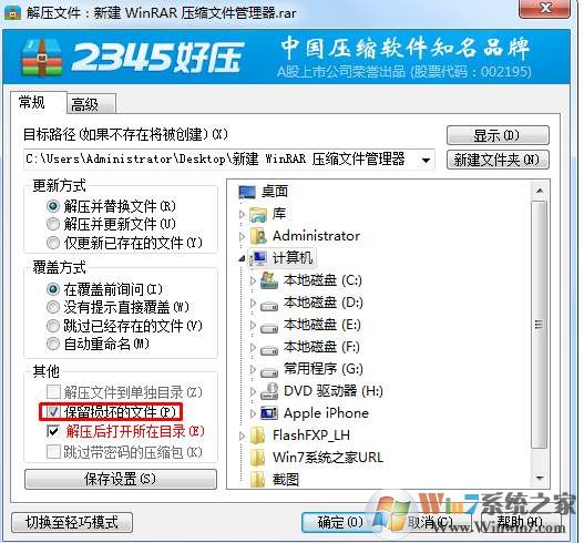 3.在从压缩文件中解压窗口的~常规菜单~其他选项框~保留损坏的文件复选框打勾;