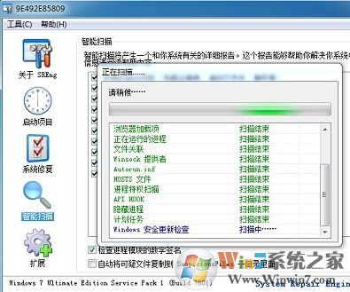 1、首先下载解压“”,运行SREng,点击左侧“智能扫描”,随后会出现一个扫描进度提示界面,如图: