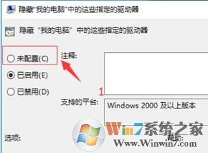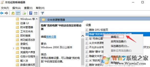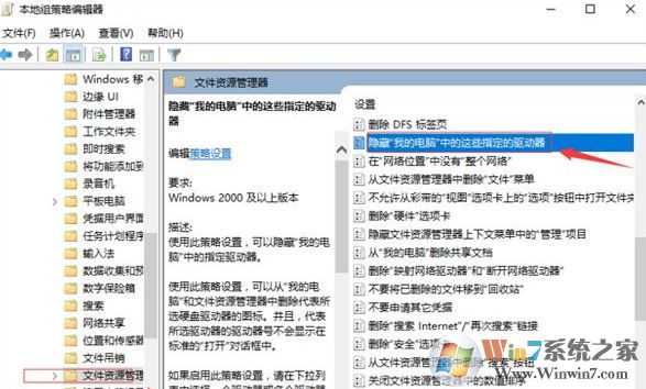 3、在本地计算机策略,用户配置,管理模板,Windows组件,Windows资源管理器,找到“隐藏我的电脑中的这些指定的驱动器”;