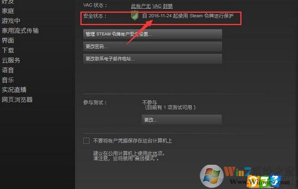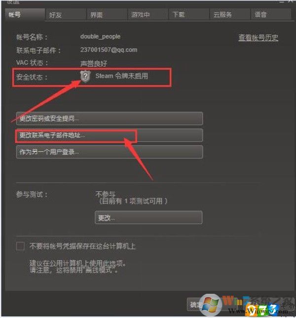 2、在设置的帐号下,可以看到安全状态。如果你在注册steam账号时没有进入你绑定的邮箱进行验证,那么你的steam令牌是未启用状态,这个时候我们需要进入你之前注册账号所绑定的邮箱中找到steam发的邮件,完成验证。如果邮件找不到了的话,那么就点击下面栏目中的“更改电子邮件联系地址”,重新填写你的邮箱,或者换一个邮箱,系统会发邮件到你所填写的邮箱中,我们需要进入邮箱,查看邮件,进行验证。