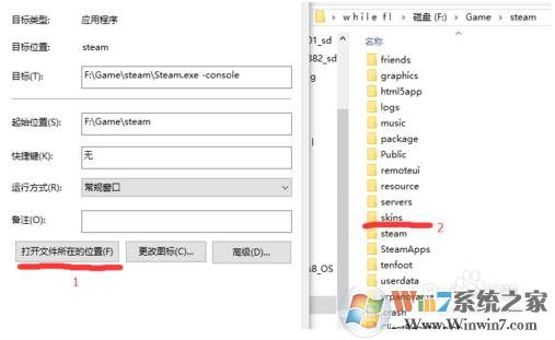 2、进入steam安装目录,不知道的朋友可以右键点击steam图标,进入属性,点击打开文件所在的位置,就可以进入steam安装文件夹,然后找到skins文件夹,点击进入。