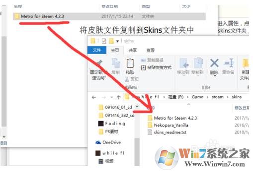 3、复制下载好的皮肤文件,(本例中为“Metro for Steam 4.2.3”),粘贴到skins文件夹中。如图。因这里已经使用了“香子兰”的皮肤,所以这里还有个文件夹为“Nekopara_Vanilla”。