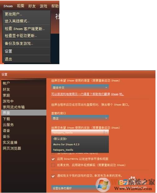4、打开steam。点击左上角steam按钮,选择设置,选择界面选项卡,在“选择您希望steam使用的皮肤”处下拉菜单中可以选择想用的皮肤。点击确定,重新启动steam。