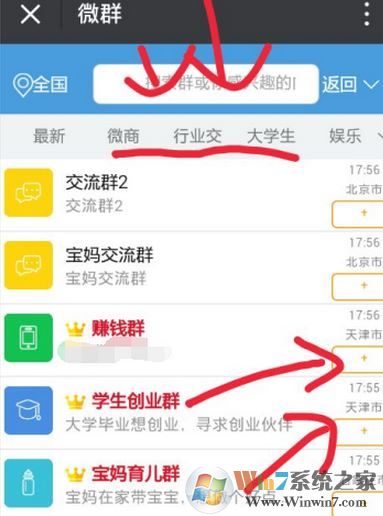 4、此时我们就可以看到许许多多的微信群,我们可以通过所在地区,行业分类来添加不同的微信群i即可!