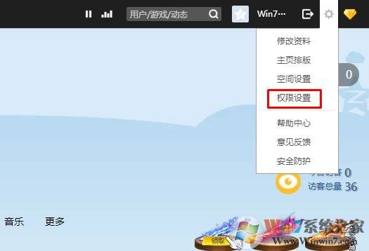 1、首先从QQ面板进入QQ空间,然后点击右上角的“齿轮”图标,选择 权限设置;