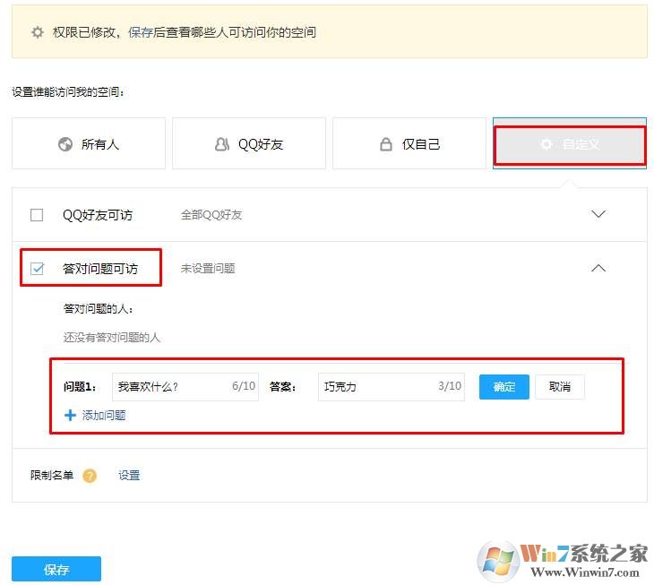 2、接下来,点击自定义,然后勾选 【答对问题可访】,设置一个问题,如我喜欢什么,答案巧克力