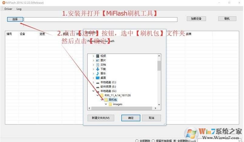 2、下载miflash刷机工具,打开,选择刷机包,然后确定;